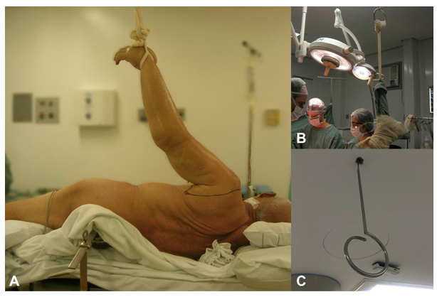 Figure 1 Patient positioned with the limb abducted 45 degrees, the wrist tied to a ceiling hook (A). Hook and tie with the limb already removed (B). Detail of the hook fixed to the operating room ceiling (C).