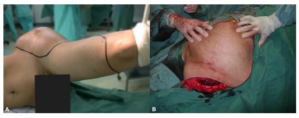 Figure 4 Patient with squamous cell carcinoma at the root of the left upper limb (LUL), in lateral decubitus and tied to the ceiling (A). Operative wound after limb removal (B).
