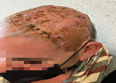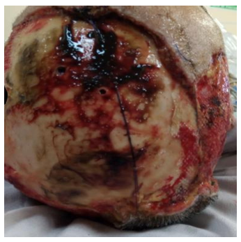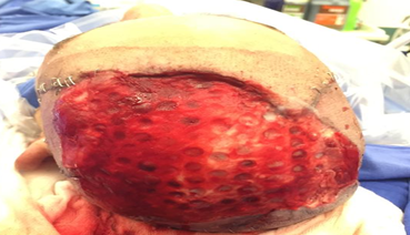 The following clinical case is presented, which corresponds to a 58-year-old female patient from the state of Puebla, resident of Ixtapaluca Estado de México, who suffered an avulsion of the scalp while working with an agricultural machine. (husker). She suffered an accident in the workplace, with craniocephalic trauma generating detachment of the hairy skin, and is transferred to the Hospital Regional Emilio Sánchez Piedras Tlaxcala, where cranial trephines were performed as a reconstructive surgical treatment method to generate granulation tissue in the biparietal area with bleeding and moderate pulsatile activity, as well as loss of 50% of the pinna, skin traction was performed to avoid retraction and loss of 80% of the scalp skin, transfer is made to the Hospital Regional de Alta Especialidad de Ixtapaluca (HRAEI) for assessment and continuation of medical-surgical care (Figure 1).