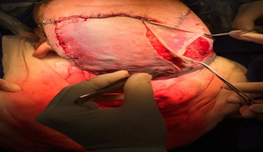 Application of skin graft - A 0.25 mm partial thickness skin graft obtained from the right pelvic limb is taken for direct application on the dermal matrix and fixed with staples (Figure 4).