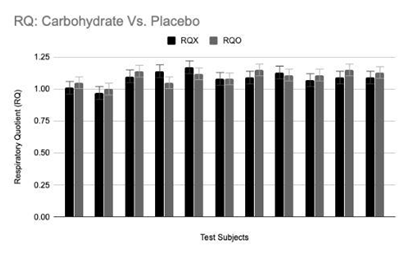 A paired samples t-test, using SPSS v. 26, was conducted to determine significance (p ≤ 0.05) on each of the four variables: VO2 max, fasting blood glucose (GLU), anaerobic threshold (AT), and respiratory quotient (RQ). No significant differences were found when comparing groups on all variables (VO2 p= 0.923,GLU p= 0.099,AT p=0.641, RQ p=0.372). See below in Table 1. Additionally, this is shown in the graphs below (Figures 1-4) when carbohydrate and placebo are compared for each test subject.