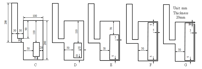 To investigate the filling of lost foam casting, a type of 100mm×200mm×20mm plate was selected as the casting specimen. The plate was cast vertically with side filling ingate system. The ingate was located at the middle of the left side of the plate, so the filling of the bottom half and the top half of the plate can be investigated. The basic section size of the sprue and ingate were 30mm×20mm and 20mm×20mm, respectively, the sprue height was 200mm. The middle of the plates were designed with different window size to create difficult filling zones and investigate their filling mode (speed and direction) and possible defects caused by filling, so, the bottom and right narrow path widths were set into options: 20mm (Shape C), 10mm (Shape D), 5mm (Shape E,F,G), respectively, as shown in Figure 1. To check the effect of entrapped air, the top right corner of the thin frame was cut off to form a non-through end, as shown in Shape G in Figure 1. A typical kind of gray cast iron HT250 (chemical composition: C3.16~3.30wt%, Si:1.79~1.93wt%, Mn:0.89~1.04wt%, S:0.094~0.125 wt%, P:0.120~0.170 wt%) was selected for experiment. Furan resin self-set sand was applied for molding. The foam pattern and gating system were made of polystyrene pieces which were cut by hot wire and then glued together. The foam material with density 16 kg/ m3 was used. Only natural ventilation was adopted, i.e, there was no ventilation holes. Water-based bauxite was used as coating, 1.5mm thick.