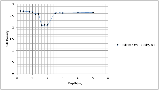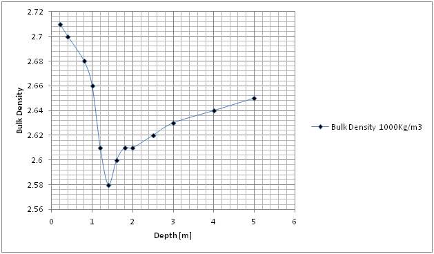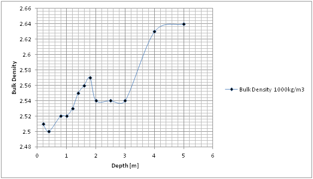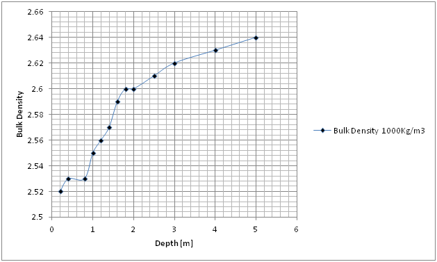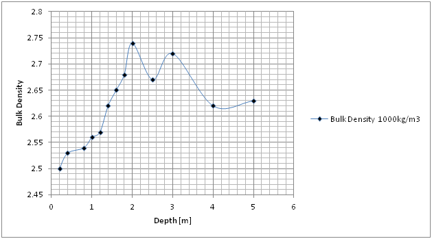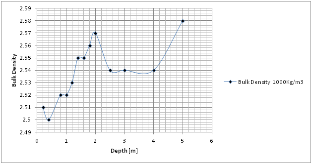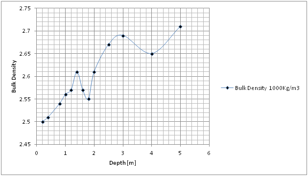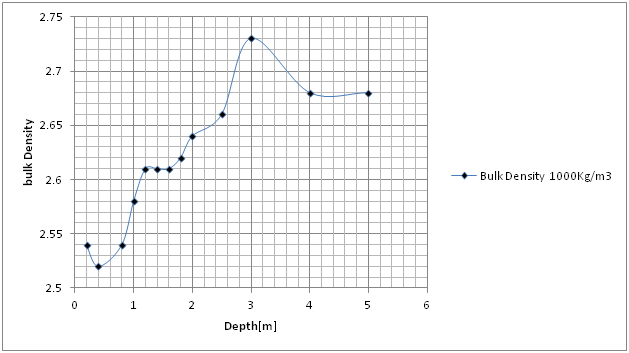 Results and discussion are presented in tables including graphical representation for bulk Density stated below (Table 6). The study has express thoroughly the behavior of soil in terms of bulk density;30–32 such characteristic was investigated to determine various (Table 7) degree of soil compaction at different lithology, Figure 1 developed vacillation from 1-5m were the optimum bulk density were observed at 3m and constantly maintain linear bulk density between 4-5m. Figure 2 developed oscillation but the optimum values was recorded at 2.5m and suddenly observed slight decrease in fluctuation form between 3-5m. (Figure 3) developed fluctuations between 1.1.5m thus experiences sudden increase between 2 and 3m and gradually increase to the optimum level at 5m. Figure 4 experienced sudden decrease (Table 8) and finally maintained linear increase between 3-5m. Figure 5 express vacillation between 1-5m, but developed optimum values recorded at 5m. Figure 6 in similar condition developed fluctuation where the optimum values were recorded at 3.5m and suddenly vacillate again between 4-5m. (Figure 7) maintained similar condition by fluctuation from 1-5m (Table 9) where the optimum values were recorded at 5m. (Figure 8) experienced slight vacillation between 1-2m and suddenly increase to optimum level recorded at 5m. (Figure 9) observed sudden increase between 1-1.5m (Table 10) and suddenly decrease with increase in depth, the developed gradual increase between 3-5m. (Figure 10) developed fluctuation from 1-5m and experience the optimum values recorded at 5m.