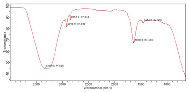 FTIR findings: Figure 2 and 3 above present the functional groups in the lotion cream are revealed by the study's FTIR analysis. Ether, phenolic, and aldehyde groups are commonly identified in cosmetic formulations. Crucially, the presence of an extra functional group in the medicated cream suggests that adding turmeric and aloe vera improves both bioactivity and aesthetic qualities.17 Similar investigations have confirmed the incorporation of botanical extracts into creams using FTIR spectroscopy; these extra peaks are indicators of enhanced antioxidant qualities and general product stability.10,18