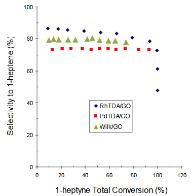 The conversions to 1–heptene vs. 1-heptyne Total Conversions (XT) for: a) [PdCl2(TDA)2] (homogeneous) and [PdCl2(TDA)2]/GO (heterogeneous); b) Wilkinson (homogeneous) and Wilkinson/GO (heterogeneous) and c) [RhCl(TDA)3] (homogeneous) and [RhCl(TDA)3]/GO (heterogeneous) are shown in Figure 3 - Figure 5 respectively (Figure 6).