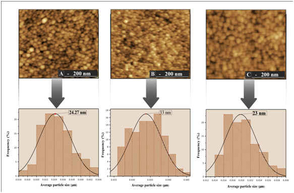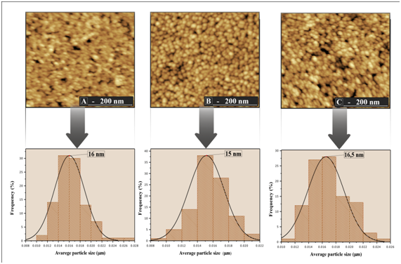 The surface morphology, particle size and, surface roughness of the thin films were characterized by atomic force microscopy (AFM) as shown in Figure 3 & Figure 4. In the images it was observed that the surface of the thin films is composed by rounded morphology particles and these particles are evenly distributed on the surface of the film whitout cracks and pores. The average particle size of the films ranged from 15 to 33 nm, which was estimated based on measurements of at least 300 microspheres in the AFM images and by fitting the resulting distribution using a Gaussian function