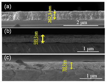 The FE-SEM image exemplified in Figure 5 shows the cross section of the films TiO2 /In2O3 in the silicon substrate, varying the number of layers (4, 8 and 16) with heat-treated at a 700 °C. It can be observed that, the thickness of the thin films was 262.3, 593.3 and 708.3 nm, respectively. Moreover, the FE-SEM image of the films of TiO2/In2O3 exhibit high thickness uniformity, adhesion to the substrate and good densification.
