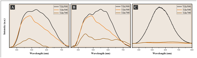 Figure 7 Photoluminescence spectra of the films TiO2/In2O3 with (A) 4 layers, (B) 8 layers and (C) 16 layers, crystallized at 300 °C, 500 °C and 700 °C.