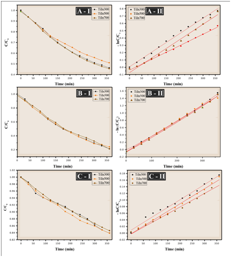 Figure 8 (I) Concentration decay curve of MB solution (II) first order reaction kinetics of the films TiO2/In with (A) 4 layers, (B) 8 layers and (C) 16 layers under UV irradiation.