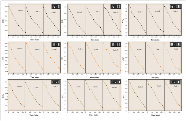 The photocatalytic process has been widely used in the treatment of domestic and industrial wastewater and the reuse of photocatalysts becomes very important, because it indicates the ability of the material to remain active even after use. It can see that the photocatalyst retains its efficiency even when reused after three reaction cycles, it can be said that there is not a considerable loss of mass during washing. Cycling uses, as well as, maintaining high photocatalytic activity are critical issues for long-term use in practical applications of the catalyst. Therefore, two criteria are required to be considered: (i) the stability of the catalyst to maintain its high activity over time, as shown in Figure 9, and (ii) The ease with which the catalyst could be recycled from solution.18