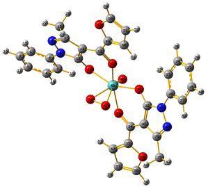 The experimental-theoretical studies presented above suggest that the studied complex in question can be formulated as [MoO(O2)(fmphp)2], where fmphpH: 4-furoyl-3-methyl-1-phenyl-pyrazolin-5-one. Considering the combinatorial experimental and calculated data, a suitable hepta-coordinated distorted pseudo-pentagonal bipyramidal geometry was proposed for the study complex, as shown in Figure 5. Based on the experimental and theoretical results, the assignments of the fundamental frequencies were observed. The computational HOMO and LUMO energies show that charge transfer occurs within the molecules.