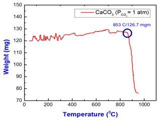 This gives T = 178500/159.1 = 1122 K = 849 °C for ΔG =ΔG° = 0, noting that this is a case of standard state equilibrium because not only the two solids (CaCO3 and CaO) but CO2 also is at the standard state (1 atm). This means that according to the published data, the onset of the descent of the curve should have been at 849 °C. The agreement between the TGA result and the published one is thus very close.