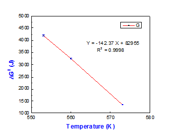 In (Figure 4), a plot of ΔG° vs T is made and a good linear fit is found, which yields the following expression for the standard free energy change of Reaction (1):