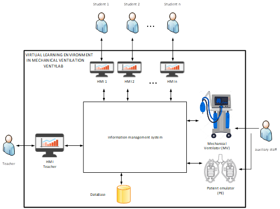 Description of the operating structure of the cyber-physical system for teleoperated practices on mechanical ventilation: The communication system proposed allows the interaction between one professor and multiple students with the mechanical ventilation and patient emulators as shown in Figure 2, it presents the general structure of the system to model, in this structure, the involved characters can be seen in the communication system and the relations.