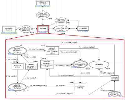 The macro transition “internet”, see Figure 6, manages all the information shared by the students, professor, and devices, an example is, the permits assigned by the professor, which are sent via the internet to the students.