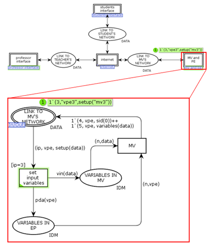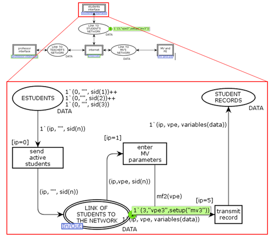 The model consists of three principal transitions (double-lined rectangles) which contain subnets defined as Professor interface, internet, MV and PE, and students interface.