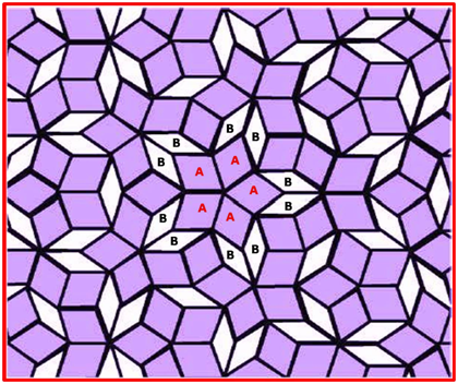 Quasicrystal phases are a novel class of intermetallics compounds that exhibit conventionally forbidden rotational symmetries in their diffraction patterns, which are incompatible with translational periodicity.16 The breakthrough on rapidly solidified Al-14% Mn alloys have created new concepts of ordered but no periodic atomic arrangements which exhibit sharp diffraction peaks with icoshahedral symmetry (m 3̄5̄). For which he was awarded the Nobel Prize in Chemistry in 2011. Using transmission electron microscopy and associated high-energy electron diffraction, Shechtman made the key observation that rapidly-quenched Al86Mn14 alloy forms small particles in which the nature and relative orientations of the rotational axes could only be explained with icosahedral symmetry as shown in (Figure 1). Furthermore, Shechtman found that these particles did not exhibit twinning, an effect that can sometimes lead to spurious indications of icosahedral symmetry in crystalline materials, notably gold. The icosahedral point group is incompatible with translational periodicity. The sharpness of the diffraction peaks was explained until this time on the basis of the periodicity of the crystalline materials. The diffraction patterns simulated from these structures are startlingly close to those observed for the icosahederal phase and this phase was termed as a quasicrystal. The mathematics of diffraction does not necessarily require periodicity; this was discussed by Mackay before the discovery of quasicrystals.17 The Mackay extended the idea of Penrose, who had developed a scheme of filling space a periodically by a finite number of tiles.18 Mackay constructed the three dimensional analogue tiles and stressed their importance in the context of crystallography. A Penrose tiling is a non-periodic tiling generated by and a periodic lay down. The aperiodicity of prototypes implies that a shifted copy of a tiling will never match the original as shown (Figure 1). The tiling uses a pair of rhombuses with equal sides but different angles. Ordinary rhombus-shaped tiles can be used to tile the plane periodically; however using a pair of rhombuses as marked by ‘A’ and ‘B’ exhibit both reflection and fivefold rotational symmetry.