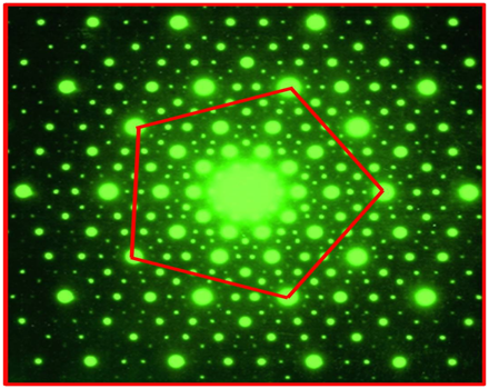Quasicrystalline materials are a novel class of intermetallics compounds that exhibit conventionally forbidden rotational symmetries in their diffraction patterns as shows in (Figure 2), which are incompatible with translational periodicity. After the discovery the first icosahedral quasicrystal, formed under rapid solidification conditions in binary Al-Mn alloy, the thermally stable quasicrystals have been discovered in several Al based materials.19,20 A beautiful morphology of a stable Al-Cu-Fe icosahedral quasicrystal has been shown in (Figure 3) respectively. The stable quasicrystals are of great interest due to their potential for creating unusual structural forms of matter having extraordinary physical properties. The stable quasicrystalline surfaces are also important for possible technological applications.21 For example, surfaces of quasicrystals exhibit high hardness and good tribological properties such as low surface friction; they also show high oxidation resistance.22