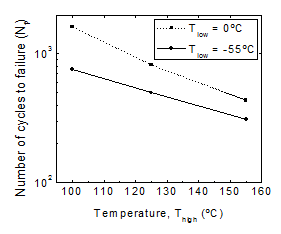 Table 3 shows the effect of epoxy thickness for the same Si-Si quilt and 20ppm/°C CTE epoxy, for 10 nodule pairs. With a reference temperature of 20°C, strain was produced by heating to 125°C. The epoxy thickness was varied from 20 to 200 m. (Figure 5) shows the plastic strain in Sn for homogeneous quilts using various epoxies, all 100 m thick. The plastic strain is computed for an entire thermal cycle: starting at the reference temperature of 20°C, heating to a high temperature (indicated on horizontal axis of the graph), cooling to a low of 0°C, and returning to the reference temperature. The plastic strain in this case has two contributions-a tensile plastic strain from the hot stage, and a compressive plastic strain from the cold part of the cycle. (Figure 6) shows the effect of changing the lower end of the temperature excursion, with different curves representing T low values of 0°C and 55°C (these choices correspond to two common experimental standards).9,10 Qualitatively, as expected, a larger temperature excursion increases plastic strain. It is instructive to compare the total plastic strain for the 0 to 155°C cycle and the 55 to 100°C cycle. Both are excursions with total range 155°C, but the higher-temperature excursion has a greater plastic strain (4.25E 3 vs 3.75E 3). Moreover, the material parameters in our model are temperature-independent, so a simple temperature shift does not cause different ranges of material-parameter values to be explored. The reason for the difference is the nonlinearity of plastic strain. In the lower-temperature cycle, the high and low temperatures differ by 80°C and 75°C from the reference temperature. The higher-temperature cycle consists of upper and lower excursions by 135°C and 20°C away from reference.
