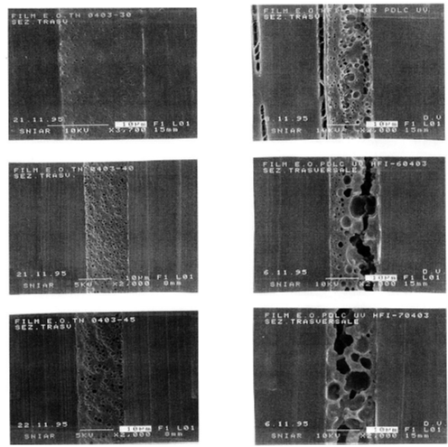 Figure 3 The SEM micrographs of <D> as a function of CLC in PDLC-TNO403 film formulations at 30% (left top), 40% (left middle), 45% (left bottom), 50% (right top), 60% (right middle) & 70% (right bottom) of TNO403.