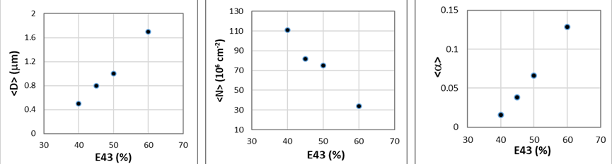 As expected, the increase in liquid crystal concentration provide the same trends on the morphologies of all three PDLC film formulations. According to Figure 2-Figure 5, the results indicate a systematic increase of <D>, decrease of <N> and increase of <α> as a function of CLC in all PDLC films with TNO403, E43 and TNO623, respectively. A typical example of variation of droplet size with CLC is also presented by SEM micrographs for PDLC-TNO403 films in Figure 3. Similar trends of morphology with concentration of liquid crystal have been observed in glass-based PDLC films in few literature works. Generally, the kinetics of phase separation and polymer curing are inter-related phenomena, where the higher phase separated micro-droplets the more matrix swelling and less plasticization by liquid crystal occurs. Although in PDLC-TNO403 (Figure 2) and PDLC-E43 films (Figure 4) the effect of CLC on the morphologies are predominately linear, such trends in PDLC-TNO623 (Figure 5) film is not and requires some explanation. It is however noteworthy that this difference could be due to limited CLC range (30-70%) and points in TNO403 and E43 cases with respect to (30-90%) and more points in TNO623 case. Also in PDLC-TNO623 films (Table 4 & Figure 5), the average droplet size <D> first exhibits a linear increase at low CLC range (30-40%), in mid concentration range (40-60%) it becomes independent of CLC and at high concentration range (60-80%) <D> again increases linearly with CLC but converges at above 80%. The CLC dependencies of <N> and <α> in PDLC-TNO623 follow trends similar to that of <D>. It should be noted that, deviation of <D> and <α> from linearity at above CLC 80% in PDLC-TNO623 formulation (Figure 5) is attributed to convergence of the sizes and phase separated micro-droplets, which is the result of larger plasticization of PDLC matrix by liquid crystal due to geometrical constraint at thin (10mm) film thickness with respect to those (15mm) in PDLC-TNO403 and PDLC-E43 films. This analogy could correctly predict that, due to relatively longer cure time and larger amount of plasticized liquid crystal at highest range of CLC should produce smaller phase-separated micro-droplets.