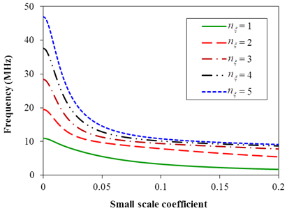 where , and represent the lower-order calibration coefficient, higher-order calibration coefficient and strain gradient parameter, respectively. Since this type of continuum modeling incorporates more scale parameters, it can better describe the size dependency at microscale levels. However, the computational cost of the modeling would significantly increase compared to the classical nonlocal modelling of protein MTs. The influence of the nonlocal parameter on the frequencies of a MT controlled by a piezoelectric nanoshell is depicted in Figure 2 for various half wave numbers in the axial direction. For more information about the mechanical properties of this system, an interested reader is referred to Ref.21 From Figure 2, it is seen that the stress nonlocality in the constitutive relation of protein MTs leads to a significant reduction in the system frequency. This conclusion is based on the fact that the structure stiffness of MTs has a decreasing relation with the nonlocal parameter. Furthermore, it is noticeable that the influence of stress nonlocality is more significant at higher wave numbers.