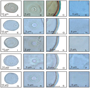 Figure 3 Poaceae pollen grains of non-native species of the Rio Grande do Sul. Oryza sativa: Pollen grain (A), detail of aperture (B), detail of exine (C), detail of ornamentation (D); Avena sativa: Pollen grain (E), detail of aperture (F), detail of exine (G), detail of ornamentation (H); Avena strigosa: Pollen grain (I), detail of aperture (J), detail of exine (K), detail of ornamentation (L); Briza minor: Pollen grain (M), detail of aperture (N), detail of exine (O), detail of ornamentation (P); Holcus lanatus: Pollen grain (Q), detail of aperture (R), detail of exine (S), detail of ornamentation (T).