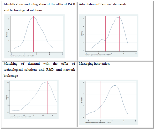Graph 1 shows the kernel density graphs that support the determination of these groups per each basic function; red vertical lines indicate where the inflection points were selected. Table 2 lists the groups of functions belonging to each of the PFs. The groups were grouped so that group 3 includes those PFs that assigned the highest values of importance to the activities that characterise the function analysed (called Active group). Group 2 is dominated by those PFs that assign low importance values (called Developing group). At the bottom of the ranking, we find Group 1, which is constituted by those PFs with the lowest performance level (called Passive group). A first look at the results listed in Table 2 shows that the PFs tend to comply with all functions of an IIO, but the effort they put into each one is different. In three functions (demand-oriented, matching supply and demand, and innovation management-oriented), groups 2 and 3 are composed of a greater number of PFs than group 1, indicating that the majority of PFs believe that those three functions are the most important to them. Likewise, none PF is clustered in the active group of the supply-oriented function, indicating that either this function is not relevant for them or they have an area of opportunity to improve their behaviour. Table 1A in the Annexe contains the main characteristics of the identified groups, which are approached through the specific activities that the PF develops and that are associated with each function. Based on these results, it is possible to extract some regularity concerning to the activities of these IIOs in the Mexican agricultural sector.