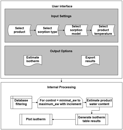 The main sorption models were revised, as well as scientific studies to determine the experimental equilibrium moisture content of different food products at different temperatures and relative humidities. This information was compiled and a database was built containing on product identification, isotherm type (desorption or sorption), model identification, model equation, product temperature, model coefficients, and literature reference from which data were obtained. The main components of the Isotherms design are presented in Figure 1. The software was written in C++ language and is meant to read the database information, estimating the sorption curve of a registered product according to a pre-selected model and temperature. Simulation results can be visualized and exported. The data format of input (database) files supported is CSV (Comma Separated Values). According to Lardy et al.,15 this file format is simple and widely used, also supported by almost all spreadsheet software and database management systems. Further, when using this file format, database updating and output analyses are facilitated. Output (result table and isotherm) is saved as electronic worksheet.