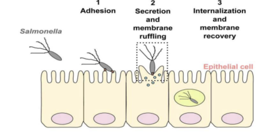 Figure 3 Salmonella adhesion and invasion of epithelial cells, and internalization into the membrane.16