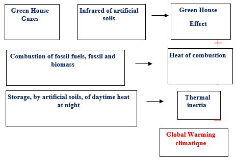 As if all this is not enough, contemporary man has further amplified the phenomenon of global warming by a second phenomenon that very few scientists have mentioned, it is the infrared radiation emitted by the earth, not naturally because this is necessary and it has always existed, but rather the supplement added by the artificialization of soils (Paved roads, buildings, vehicles, artificial turf.).. Indeed, they absorb solar radiation and convert it into far-infrared radiation, which is trapped by the atmosphere. In its natural state, without these artificial surfaces, incident solar radiation intercepts the Earth's soil, and a large portion is reflected back into the sky, easily passing through the Earth's atmosphere.