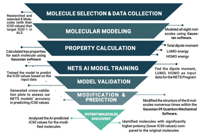 The goal of this research is to take known therapeutic drugs that target (inhibits) SOD1 protein in the treatment of ALS. By leveraging molecular modeling (Gaussian 09 Quantum Mechanical Software), modify these molecules, to identify modified small drug molecules with increased potency. To achieve this, an Artificial Intelligence (AI) software, NASA Software (NETS Back propagation Simulator) was trained to predict the IC50 values of the newly modified molecule drugs. The half maximal inhibitory concentration (IC50) of a drug-like compound is an informative measure of its effectiveness. A lower IC50 value indicates the molecule’s effectiveness at low concentration.