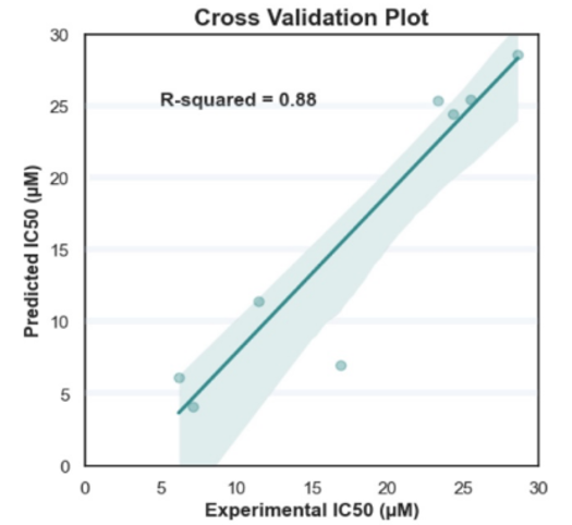 Figure 3 below shows the cross-validation plot, the experimental literature IC50 values on the x-axis and the AI predicted IC50 values on the y-axis. Each data point within the plot corresponds to an individual molecule (Table 2).