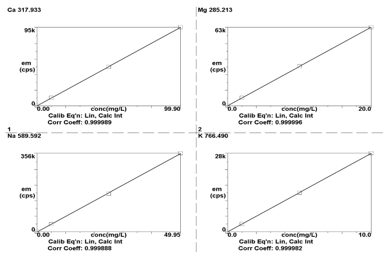 The calibration was prepared using a multi-element standard solution in a matrix of 3% HNO3, with linear correlation coefficients for all elements greater than 0.999. Figure 1 shows the calibration curves for typical elements such as Ca, Mg, Na, and K.