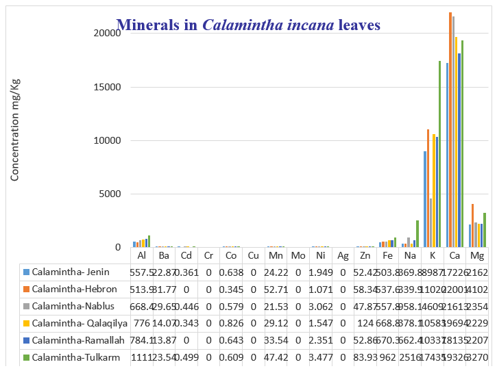 Calamintha incana (C. incana) is widely used in Palestine as a medicinal tea, traditionally valued for its therapeutic properties and aromatic essential oils. The region’s diverse topography and rich biodiversity contribute to the plant's unique phytochemical and elemental composition. While the essential oils of C. incana have been previously studied, its inorganic profile remains less explored. This study investigates the metal content in the leaves of wild C. incana collected from various regions in Palestine using inductively coupled plasma–optical emission spectroscopy (ICP-OES). Eighteen elements were detected in dried leaf samples, including macro elements (Ca, K, Mg, Na), essential trace elements (Fe, Mn, Zn, Cu, Mo, Ni), and potentially toxic metals (Al, Cd, Cr, Co, Ag, Ba). High concentrations of calcium (17,226–22,001 ppm), potassium (4,609–17,435 ppm), and magnesium (2,160–4,100 ppm) were observed. Notably, aluminum levels were elevated in six samples (513.9–1,111 ppm), while toxic metals such as Co, Cd, Ni, and Cr were present in lower concentrations. These findings contribute to a more comprehensive understanding of C. incana’s chemical profile, highlighting its potential nutritional and toxicological implications in traditional medicinal use.