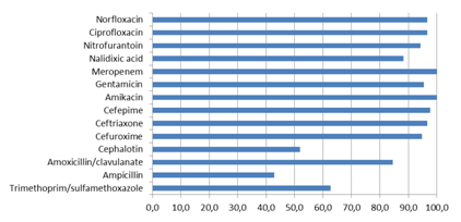 During the 5-year study period, a total of 1174 UTI episodes were identified. E. coli was the most frequent agent, accounting for 847 (72.1%) of all the community-acquired UTI in our sample. Other microorganisms included Proteus mirabilis (193; 16.4%), Klebsiella pneumoniae (63; 5.4%) and Enterococcus faecalis (16; 1.4%). The analysis of the UTI episodes caused by E. coli showed a higher prevalence among females as compared to males (78.4% vs. 21.6%, p<0.0001). The median age was 30.2 months (IQR 10.1‒73.9 months). Among the 847 E. coli isolates, the prevalence of ESBL-producing strains was 2.1%. High antimicrobial susceptibility (>80% of the isolates) was observed for the following antibiotics: amoxicillin-clavulanate (84.5%), second, third and fourth-generation cephalosporins (cefuroxime, 94.8%; ceftriaxone, 96.7%; cefepime, 97.8%), aminoglycosides (gentamicin, 95.4%; amikacin, 100%), meropenem (100%), nalidixic acid (88.3%), nitrofurantoin (94.2%), and quinolones (ciprofloxacin, 96.6%; norfloxacin, 96.6%). Low antimicrobial susceptibility of the E. coli isolates was observed for ampicillin (42.9%), cephalothin (51.9%), and trimethoprim-sulfamethoxazole (62.6%). The antimicrobial susceptibility profile of the 847 E. coli isolates is shown in Figure 1.