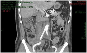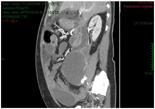 Figure 1: Abdomen CT-scan with contrast that reported organized hematoma along the right iliac branch associated to intraperitoneal serous-hematic fluid.