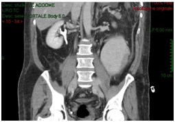 Figure 3: Post paracentesis Uro-CT scan showing reduction of intraperitoneal fluid, right iliac side fluid collection with contrast enhancement during delayed phases; right ureter was not visible under fluid collection.