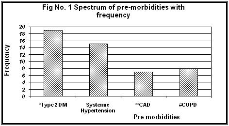 Pre- Morbidities & Co-morbidities: The pre-morbidities are defined as those diseases which were present in the patient long before the present disease had manifested. The pre-morbidities under study were Type 2 Diabetes Mellitus, systemic hypertension, coronary artery disease and chronic obstructive pulmonary airway disease. The co-morbidities have been classified into six on the basis of the systems affected (Figure 1). They are as follows