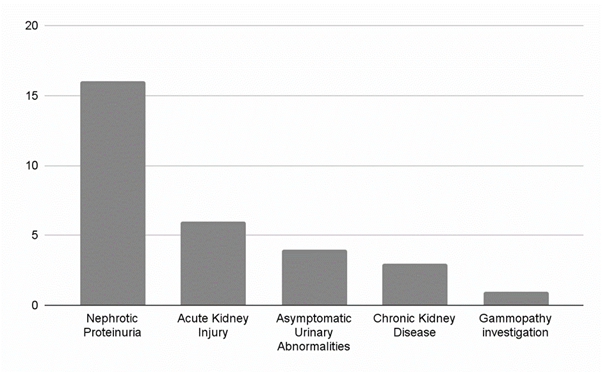 The most common indication for KB in the overall sample was nephrotic proteinuria in 53,3% of patients (n = 16), followed by acute kidney injury in 20% (n = 6) and asymptomatic urinary abnormalities in 13,3% (n = 4).