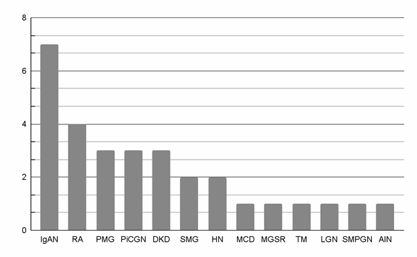 Renal diseases were divided into four groups: 1) primary glomerulonephritis (GN); 2) secondary GN; 3) tubulointerstitial diseases, and 4) other diseases. Primary GN included: crescent glomerulonephritis (CreGN), focal segmental glomerulosclerosis (FSGS), idiopathic membranous nephritis, IgAN, membranoproliferative glomerulonephritis (MPGN), mesangial proliferative glomerulonephritis (MsPGN) and Minimal Change Disease (MCD).