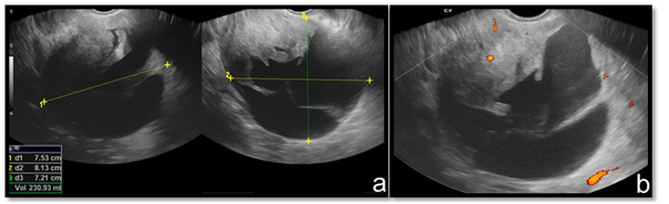 Figure 1 Transvaginal pelvic ultrasound. Solid and cystic expansive formation (A). Scarce blood flow to color Doppler (B).