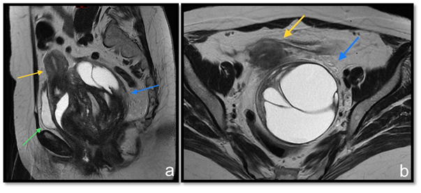 Figure 2 T2 weighted MRI sequences at sagittal (A) and axial (B) planes. Pelvic expansive formation (blue arrow) promotes uterus (yellow arrow) and bladder (green arrow) displacement from their usual topography.