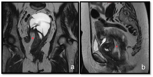 Figure 3 T2 weighted MRI sequences at coronal (A) and sagittal (B) planes. Fat from the right ischiorectal region insinuates along the lesion to the pelvic region (red asteristic).