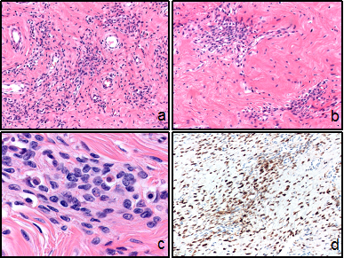 Immunohistochemically, the stromal cells are typically strong and diffusely positive for vimentin and desmin, estrogen and progesterone receptors. The cells shows variable reactivity for smooth muscle actin and CD34, although they are usually negative for those markers.8 Deep (aggressive) angiomyxoma represents the main differential diagnosis of angiomyofibroblastoma due to its equal preference for the female pelvic and perineal tissues, although, should be distinguished by its recurrent potential.8 In contrast to angiomyofibroblastoma, deep angiomyxoma is uniformly paucicellular. Both tumors have a similar immunophenotype, therefore distinction is based solely on the morphologic differences and clinical and radiological features.14,15 The recommended treatment of angiomyofibroblastoma is simple local surgical excision as recurrences are very rare. However, when there is doubt about the diagnosis, especially because of its similarity with deep angiomyxoma, resection with wide margins might be indicated with both short and long-term postoperative follow up.16
