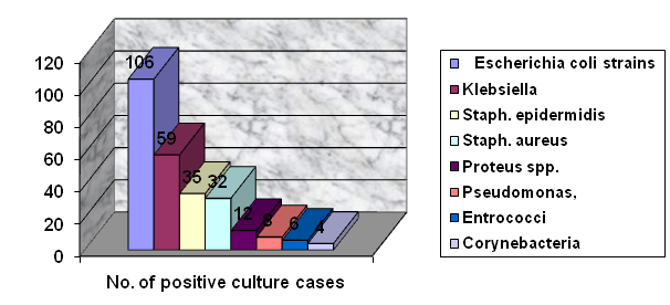 The study was done on a total of 773 urine samples from patients clinically diagnosed as UTI in Al-Batnan Medical Center, during four months October and November 2003, October and November 2004. Out of the 773 cases examined microbiologically 262 showed positive growth on bacterial cultures, 173(66%) of them were children under 12 years old. UTI patients with no bacterial growth, represent 511(66.1 %), meanwhile cases with positive bacterial growth, represent 262(33.99%) (Table I). The isolated pathogenic bacteria causing UTIs were Escherichia coli strains isolated in 106 (40.46%) in cases with UTI, Klebsiella in 59 (22.52%), Staph epidermidis in 35 (13.3%), Staph aureus in 32 (12.12%), Proteus spp in 12 (4.5%), while 8 (3.05%), 6 (2.29%), 4 (1.53%) of cases were produced by Pseudomonas, Entrococci and Corynebacteria respectively Table 2.