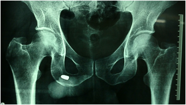 Case summary: 45 years male with a history of a gunshot fired from the left side of the hip with a retained bullet in the penis. On evaluation no history of hematuria, no difficulty in walking. On examination, entry wound was found on the left side of buttock with no other injury mark except bruise at the base of the penis. The bullet was seen in the distal part of the penis on X-ray pelvis. No hematuria was seen. Retrograde urethrogram was normal. Pelvic X-ray was normal except a retained bullet was seen in distal part of the penis. The bullet was removed from the penis under local anaesthesia. Postoperative period was uneventful.