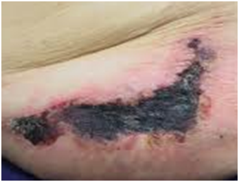 Marked improvement of calciphylaxis has now been reported with the use of intravenous sodium thiosulfate. Sodium thiosulfate is a potent antioxidant and it also increases the solubility of calcium deposits. Success has been reported in uremic and nonuremic calciphylaxis.2 The mainstay treatment of this condition was the use of sodium thiosulphate infusion of 25gm over 1 hour post hemodialysis for 6 months in addition to the other supportive measures (reduction of serum Ca, Phos., CaxPh product and PTH to the recommended target levels).3 All of these measures led to complete cure of this condition after 6 months (Figure 4) and there was no surgical interference in this case. However, aggressive wound care and debridement of necrotic tissue may be necessary to avoid wound infection, sepsis, and some advice against debridement. Currently, there is no consensus on wound management.4