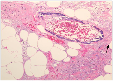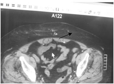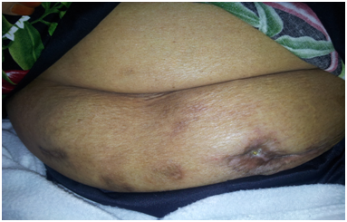 A 74 years old lady known to have end stage renal disease secondary to long standing diabetic & hypertensive nephropathy has been on hemodialysis since November 2010. Hypothyroidism on Eltroxin 150ug, hyperlipidemia on atorvastatin was admitted to the surgical department for debridement of her painful lower abdominal skin lesions which were progressing in size x 3weeks. No history of recent contrast exposure, trauma or any local injections other system review was irrelevant. On examinations there were skin lesions (Figure 1) in the form of ill-defined black indurated tender plaques, varying in size, scattered only in her lower abdominal wall with no observed lymphadenopathy or discharge. Rest of her general and local examination was unremarkable. Her laboratory investigations showed: Serum creatinine 855umol/l, BUN 19umol/l, S-albumin/total proteins 27/55, CK Normal. Serum calcium 2.5umol/l. S-phosphorus 1.5 umol/l, Ca x ph 3.75. PTH range over last 6 months was around (I molecule 13.5 -21pmol/l. Wbc’s 10.Hgb 8.9 platelet 175. ECG , ECHO & Nuclear study all were normal, Parathyroid U/S and scan were normal. CT scan (Figure 2) showed subcutaneous calcifications, skin biopsy (Figure 3) shows intramural calcific deposits.