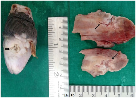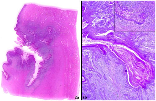 A 63 year old man, treated for nephrolithiasis five years back presented with penile growth since 11/2 years. Genitourinary examination showed ulcer on dorsum of penis, surrounded by verruciform lesion involving glans and corona sulcus. Biopsy of verrucous lesion done outside had revealed verrucous carcinoma, which on review was confirmed in our institute. Based on biopsy reports, partial penectomy was done. Histopathological examination revealed white lesion with nodular surface having both exophytic and endophytic components. Multiple sinuses were noted on surface of endophytic lesion which on cut surface displayed a branching and deeply burrowing pattern (Figure 1).